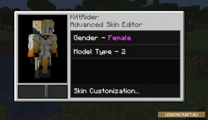 Мод на настройку скина персонажа Advanced Skin Customization предназначен для изменения главного меню игрока находящегося на главном экране, а так же изменяет вид от первого лица. Теперь вы сможете видеть все тело своего персонажа вместе со скином. Реалистичность повышается тем, что если вы смотрите наверх, то рук вы не увидите.